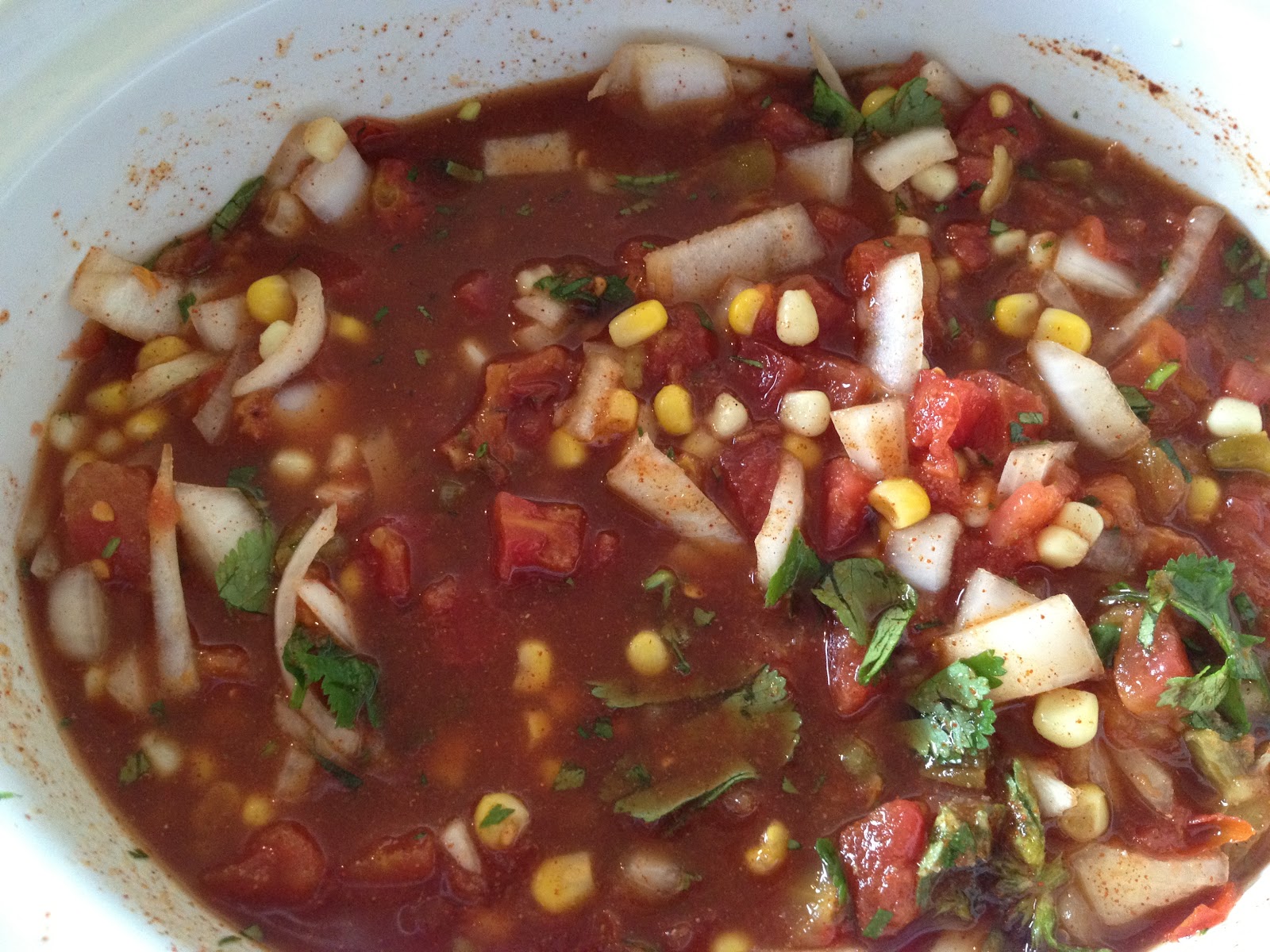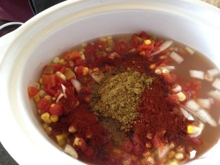 Put chopped onion, rotel, corn, chicken broth, water, and spices in CrockPot and stir. Put chicken breasts on top of mixture and make sure they’re at least partly submerged in liquid. Cook on high 6-7 hours or low 8-9 hours. Before serving remove the chicken breasts from soup and shred it before returning it to CrockPot. Stir to combine.