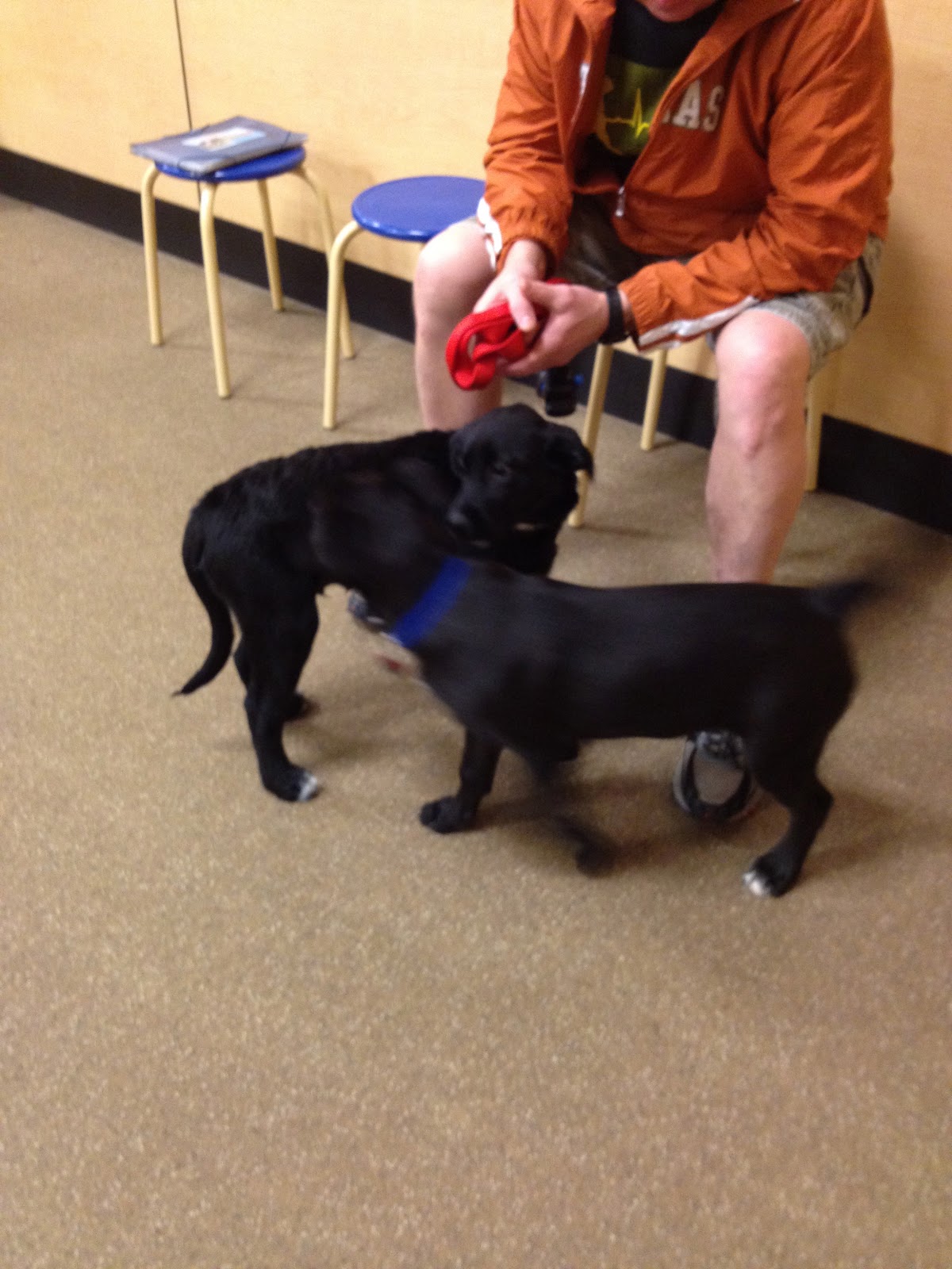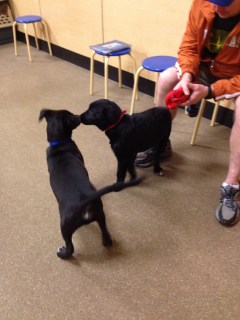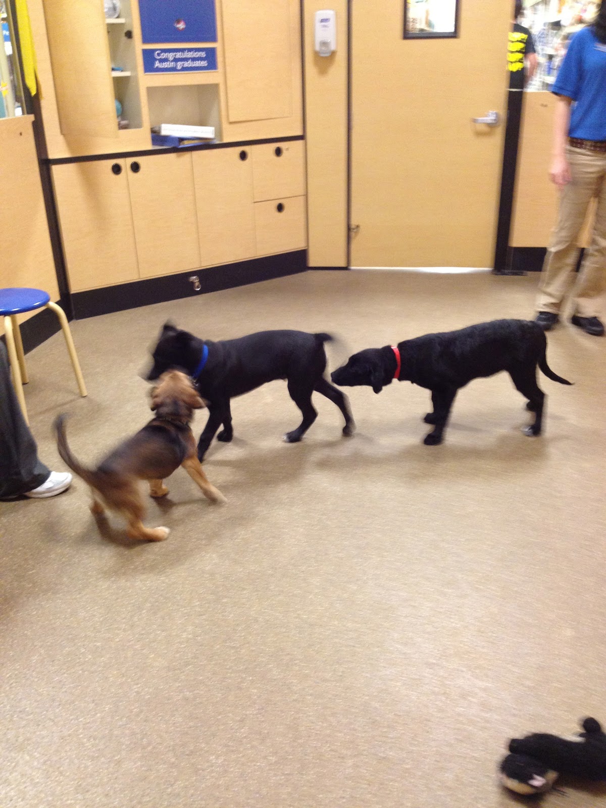 There are three dogs in the class. Cooper and two dogs named Charlie. Black Charlie looks a lot like Cooper, but with shorter hair. That was his best friend during socialization time. Brown Charlie really was kind of nervous with the other two.