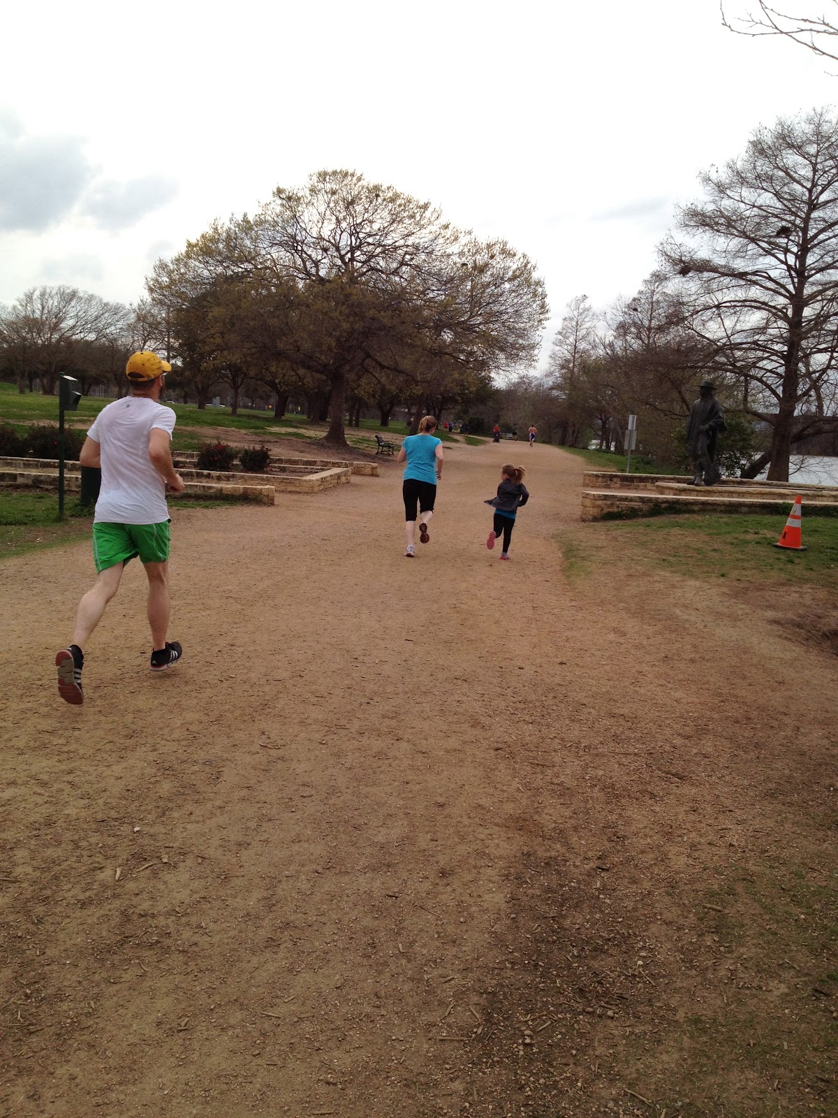 One of the best things about Austin is Lady Bird Lake.  We LOVE to walk or run around it every chance we get.  Yesterday was even better because I got to walk around it with a few of my favorite people.  I’ve never really walked with a little girl before, but it was hilarious.  She would RUN really fast to a set point and then tell us she was tired.  We gave her jobs to do like counting the turtles she saw or the dogs she saw.  That kept her pretty happy until she fell.  Poor thing nearly died!  Really it was just a scratch, but to a five year old, that’s pretty traumatic.  She got to ride in the stroller on the way back, so all was good.