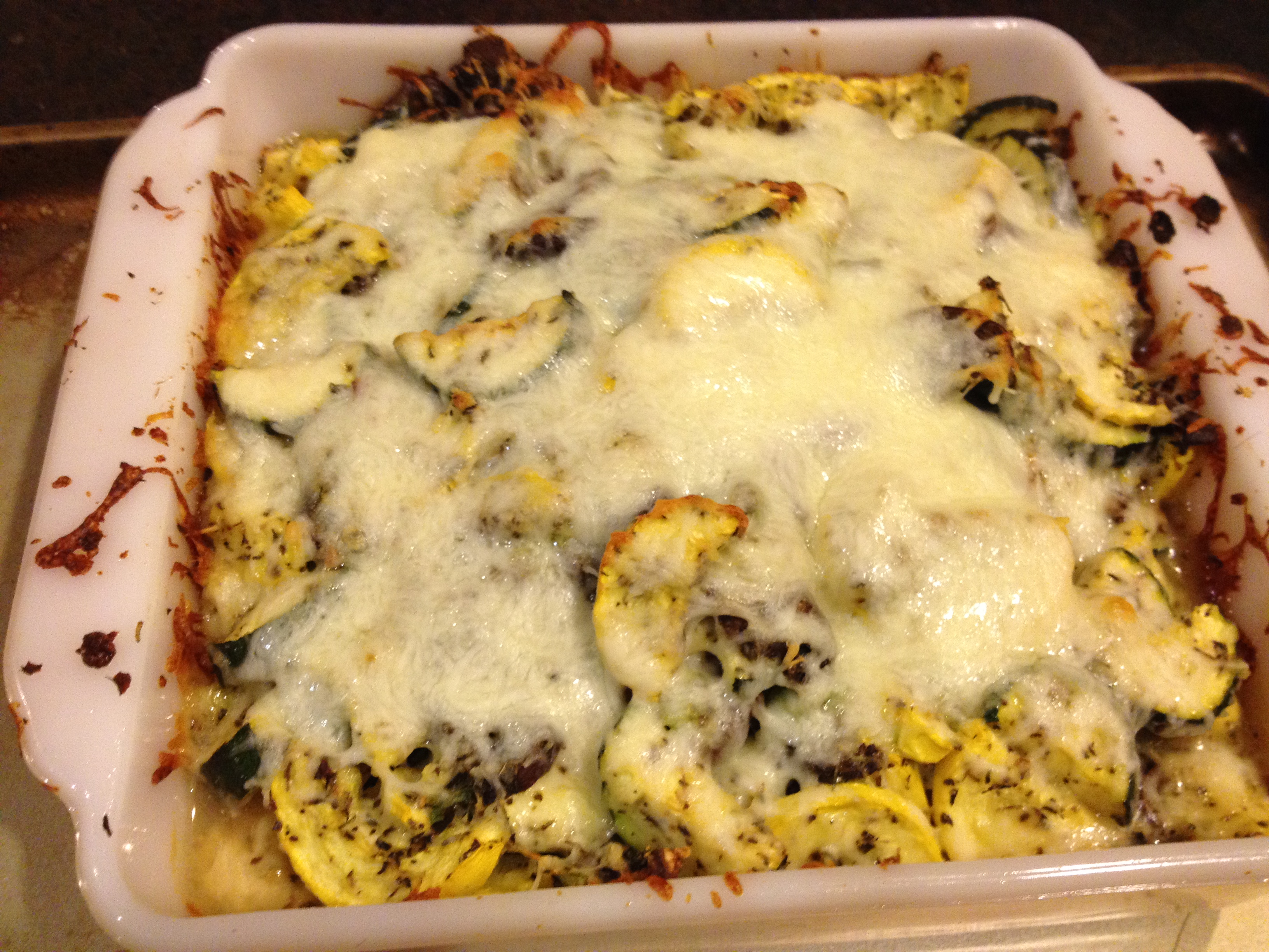 When the zucchini is nearly cooked through, take the casserole dish out of the oven and sprinkle over the remaining 1/2 cup of grated cheese. Put the dish back in the oven and bake for another 10-15 minutes, or until the cheese is melted and browned, (if you like cheese that way). Serve hot.