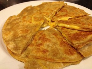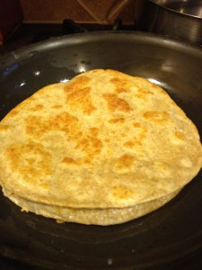 OMG!! I am out of chips, so I can’t make nachos! I almost had to go without dinner tonight until I found tortillas in my fridge. I decided I could make some cheese quesadillas. They are almost as easy to make as nachos and they have CHEESE!! I only had wheat tortillas, so I had to make due, but flour tortillas are better because they get pretty crunchy if you cook them long enough!