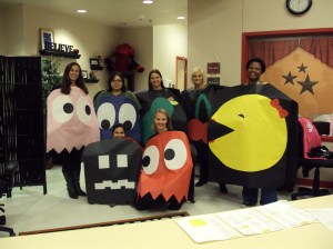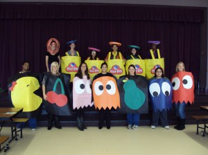 One of my favorite things we do at my school is our annual costume parade! Every year, our office dresses up in home-made costumes and marches through the halls with the rest of the kids in the school. The younger students are on parade while the older students pass out candy to them. Everyone has a great time and the parents even join in the fun! This year’s costume was one of the easiest to make. All we used was butcher paper, glue and yarn! We did all of this without patterns or even trying to draw it first. I can also tell you this is one of the best parades we ever had. Almost all the kids dressed up and brought candy! It was big fun for all!
