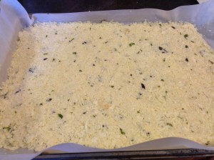 Spread the cauliflower crust ingredients on a cookie sheet covered with parchment paper and sprayed with Pam. Bake the crust at 450 for 15 minutes. While you are waiting, prepare the toppings.
