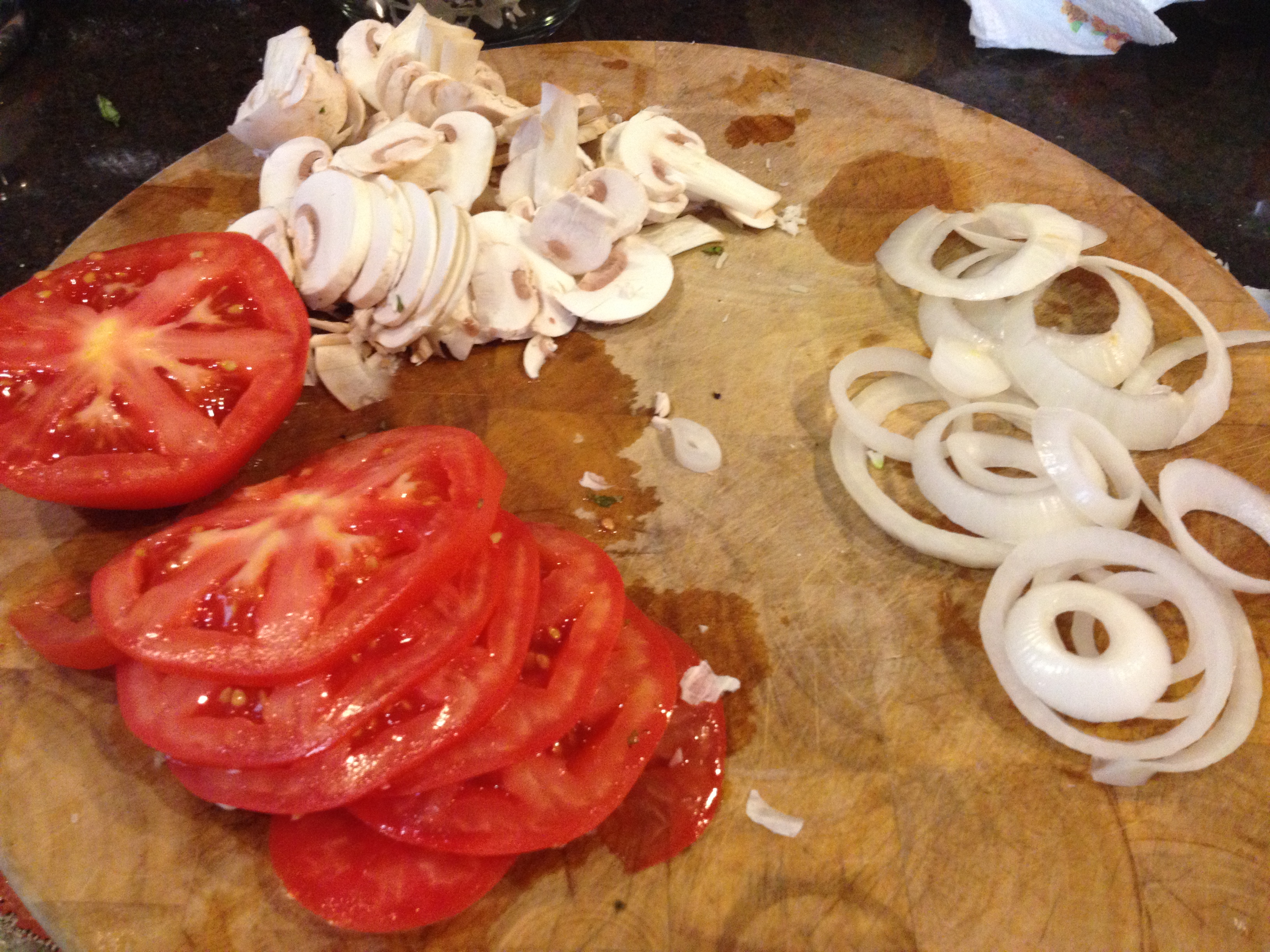 Put the toppings on the crust. Pizza sauce, then cheese, then tomatoes, then onions, then mushrooms, then basil ricotta.