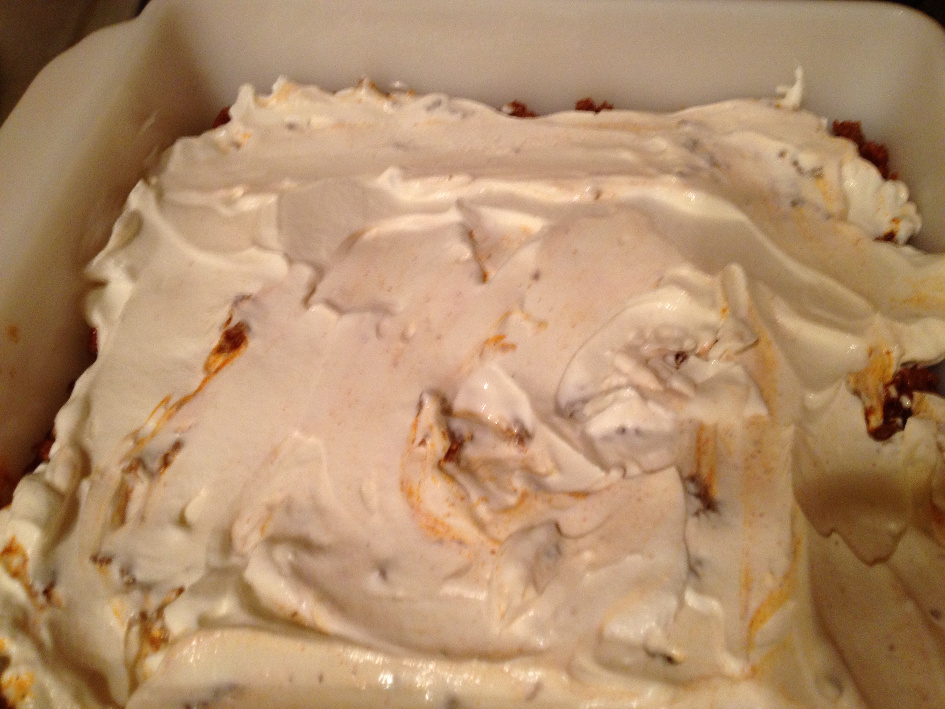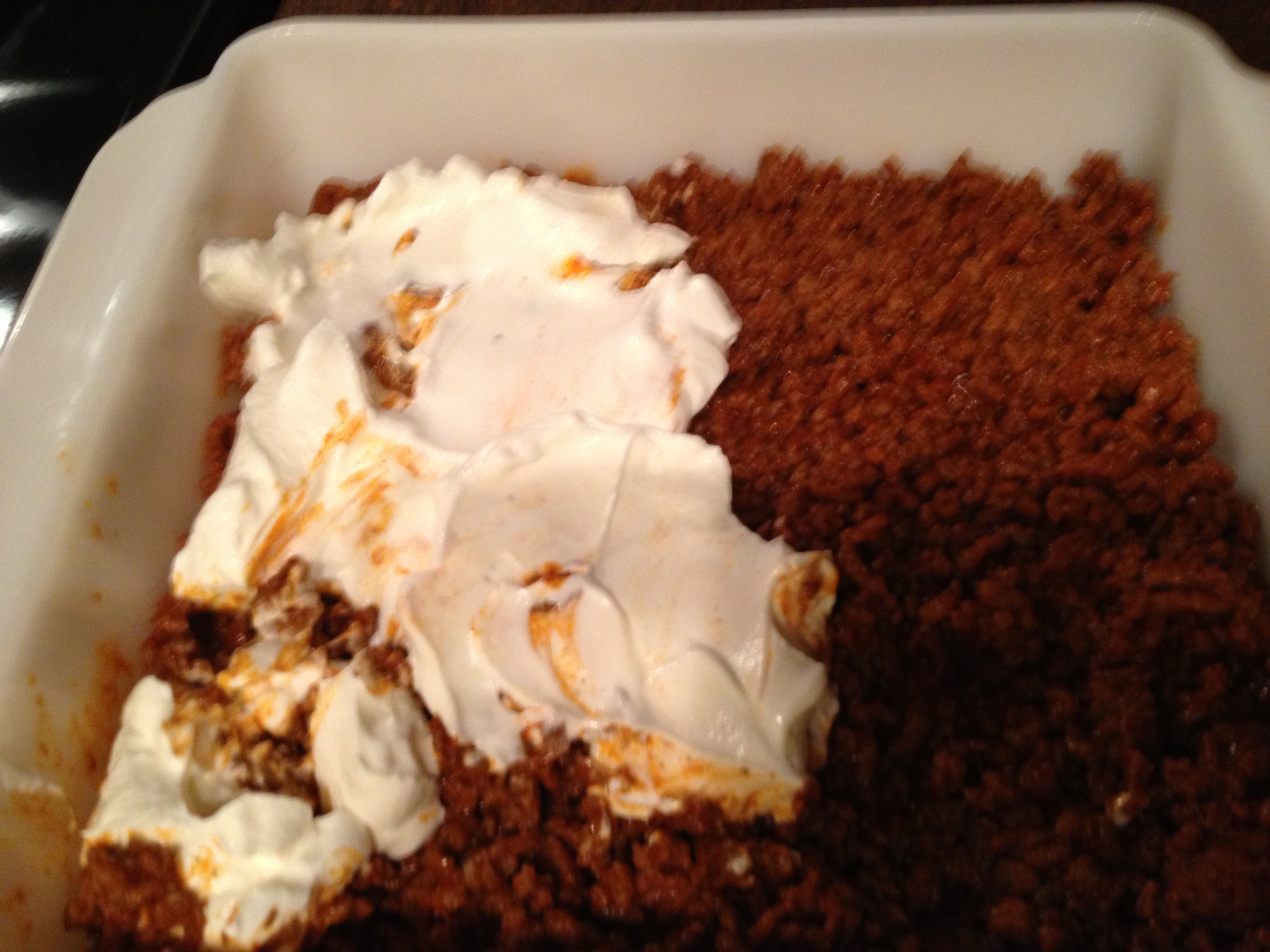 Put the taco meat in a casserole dish. Layer sour cream on the taco meat.