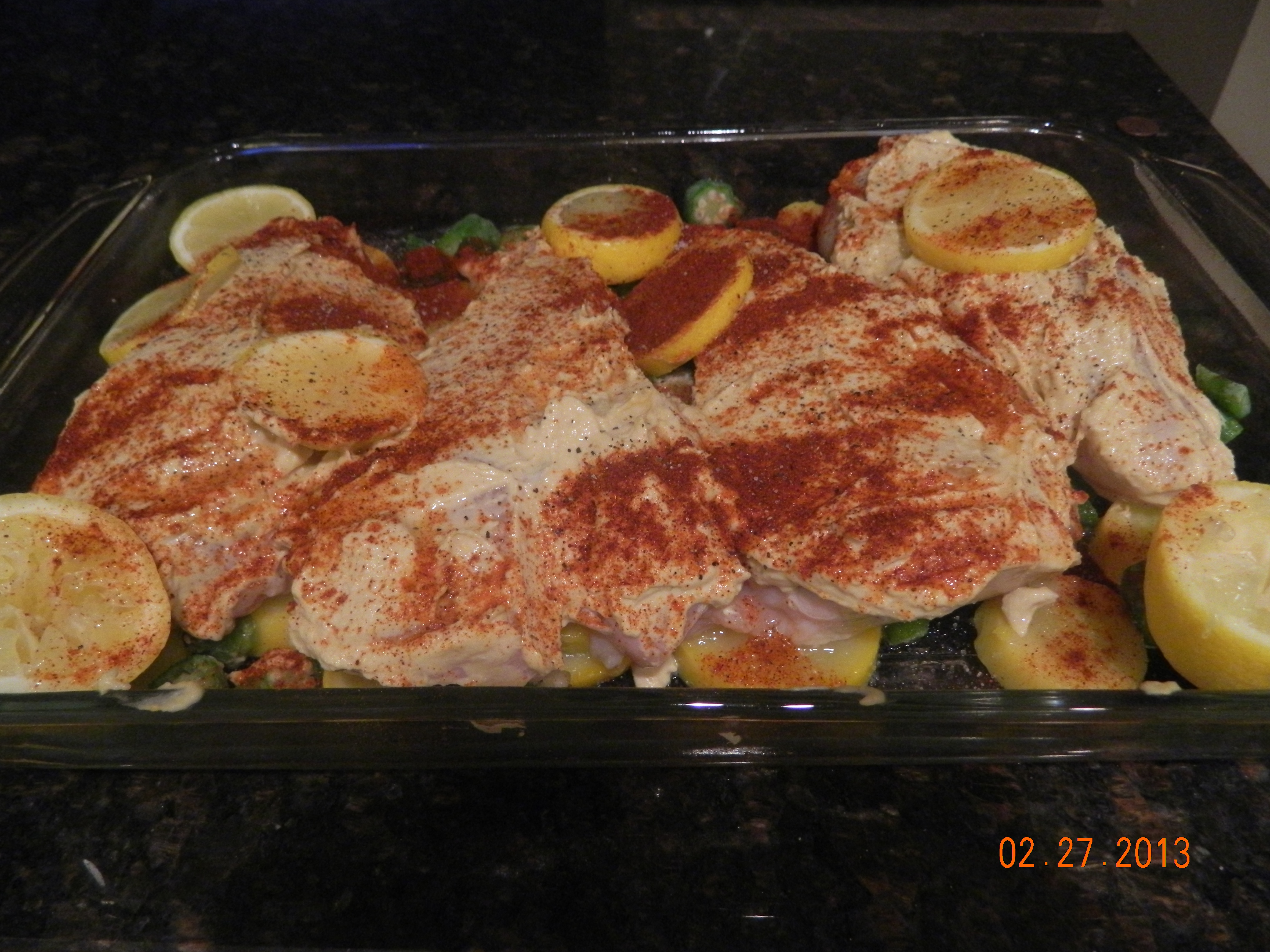 Sprinkle paprika over the chicken, add salt and pepper and squeeze lemons all over the dish. Make sure to get some of the spices on the vegetables