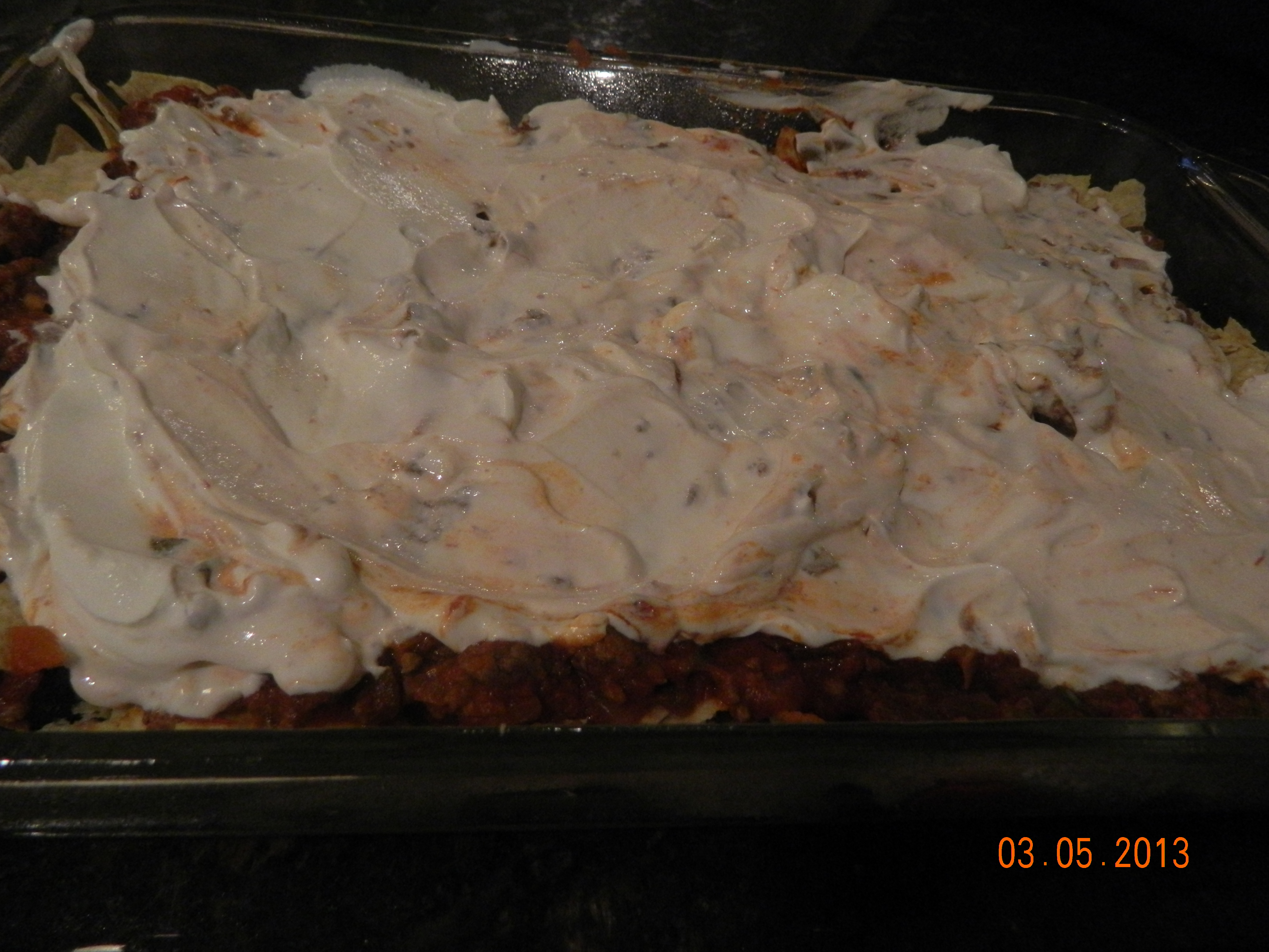 Spray pam on the bottom of the casserole dish, then crush up some chips to cover the bottom of the dish.