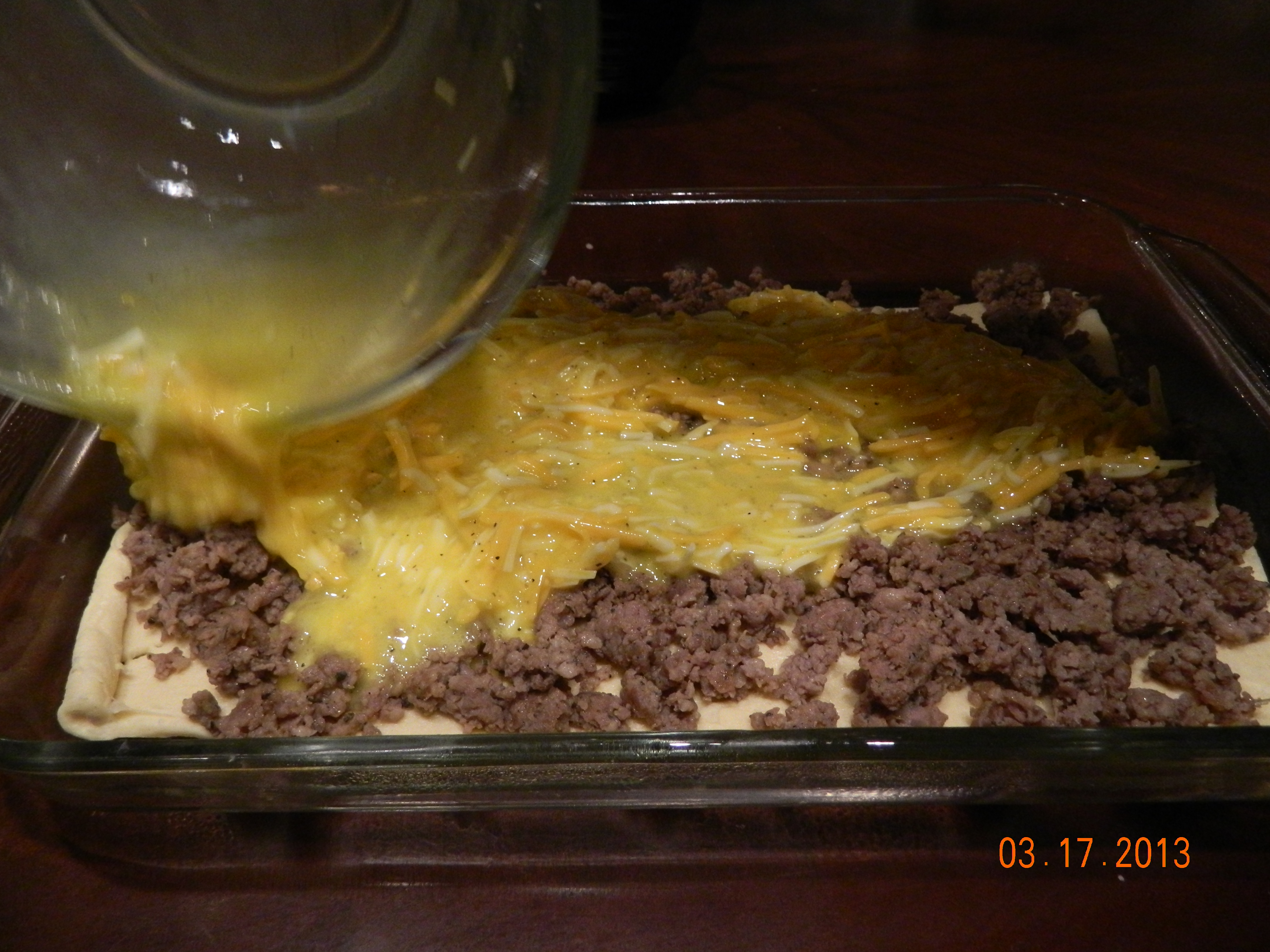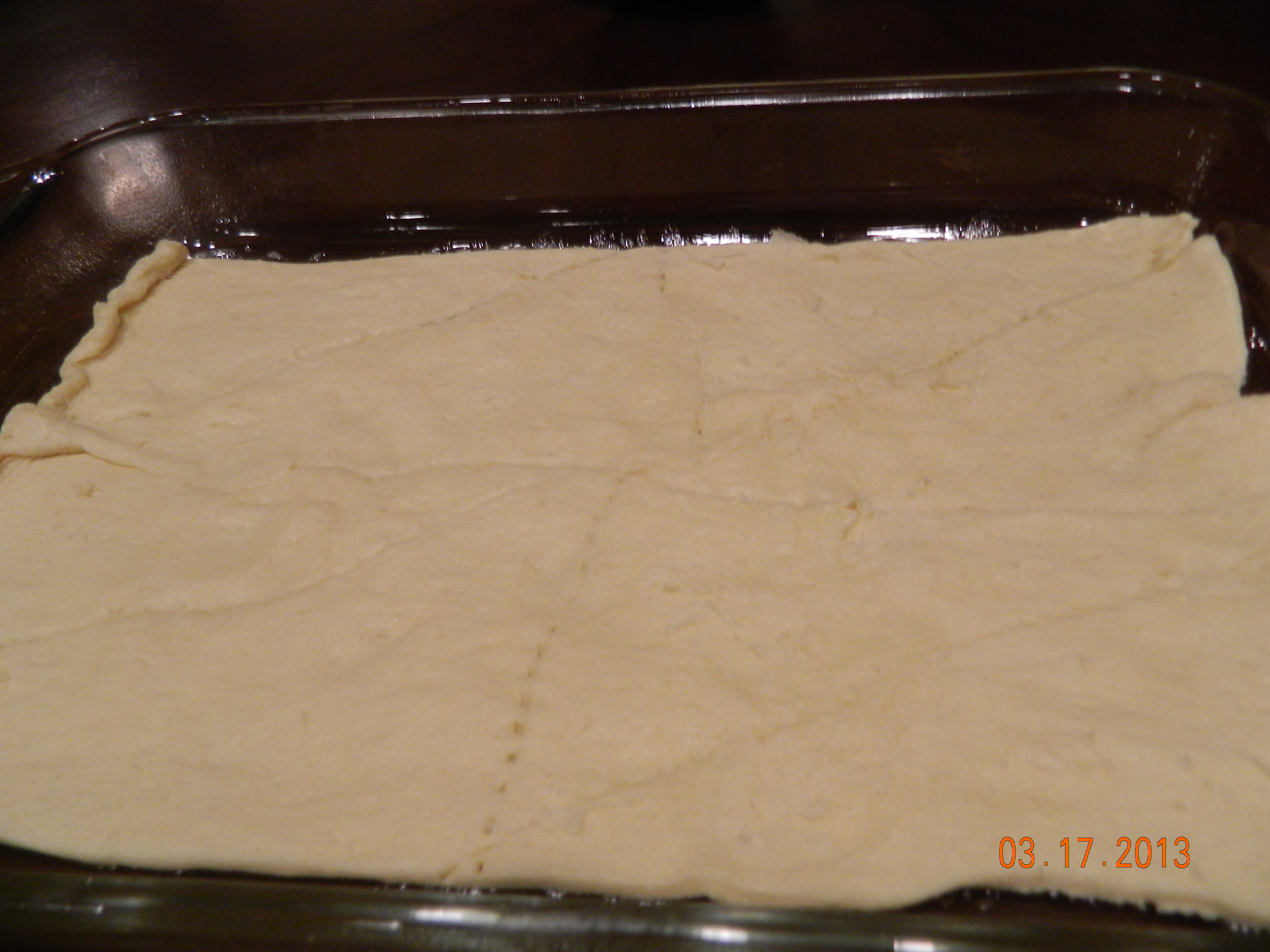 Put Pam on a casserole dish and then roll out the crescent roll on to the dish.
