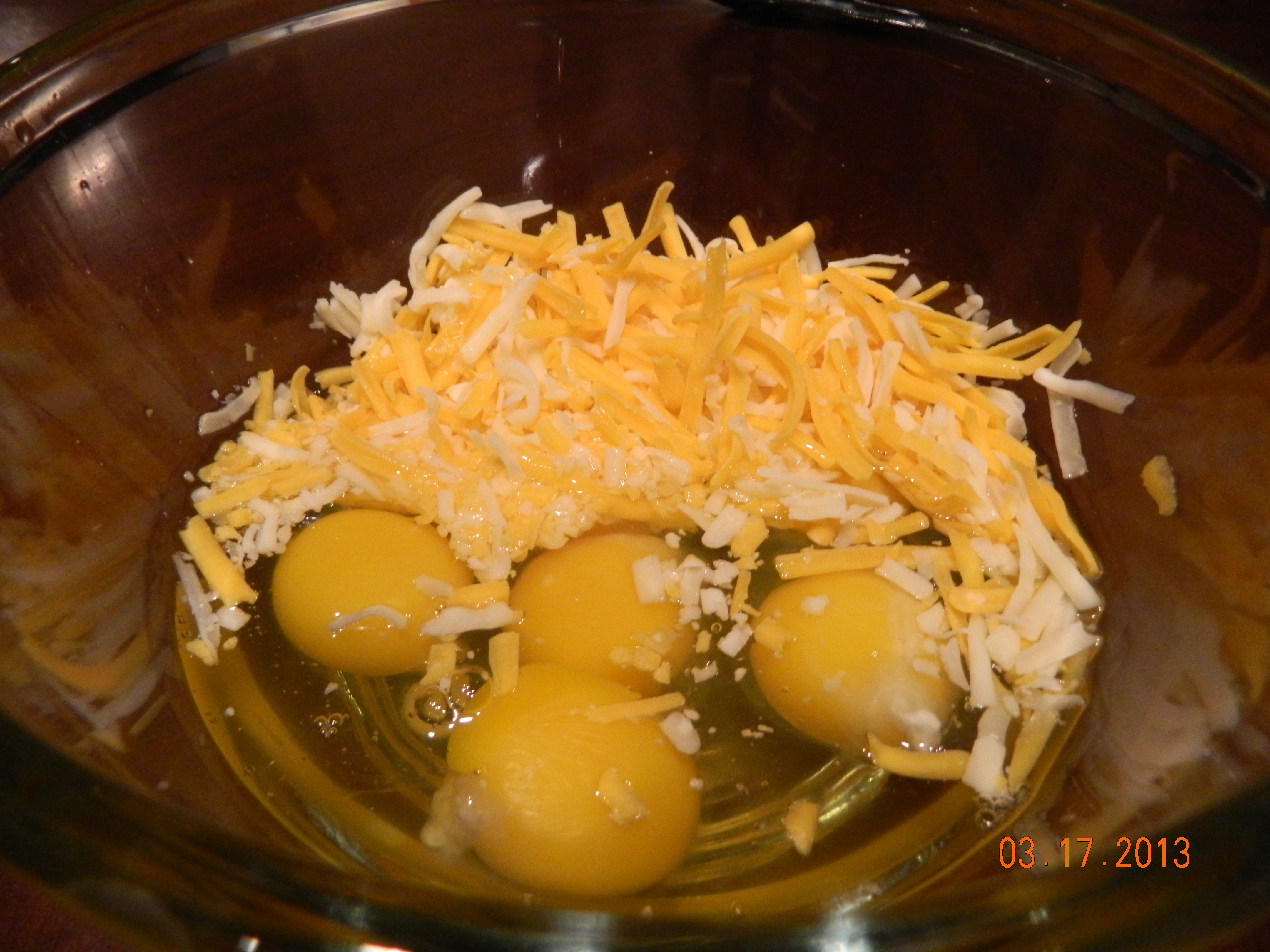 Mix eggs, cheese, salt, and pepper in a bowl.