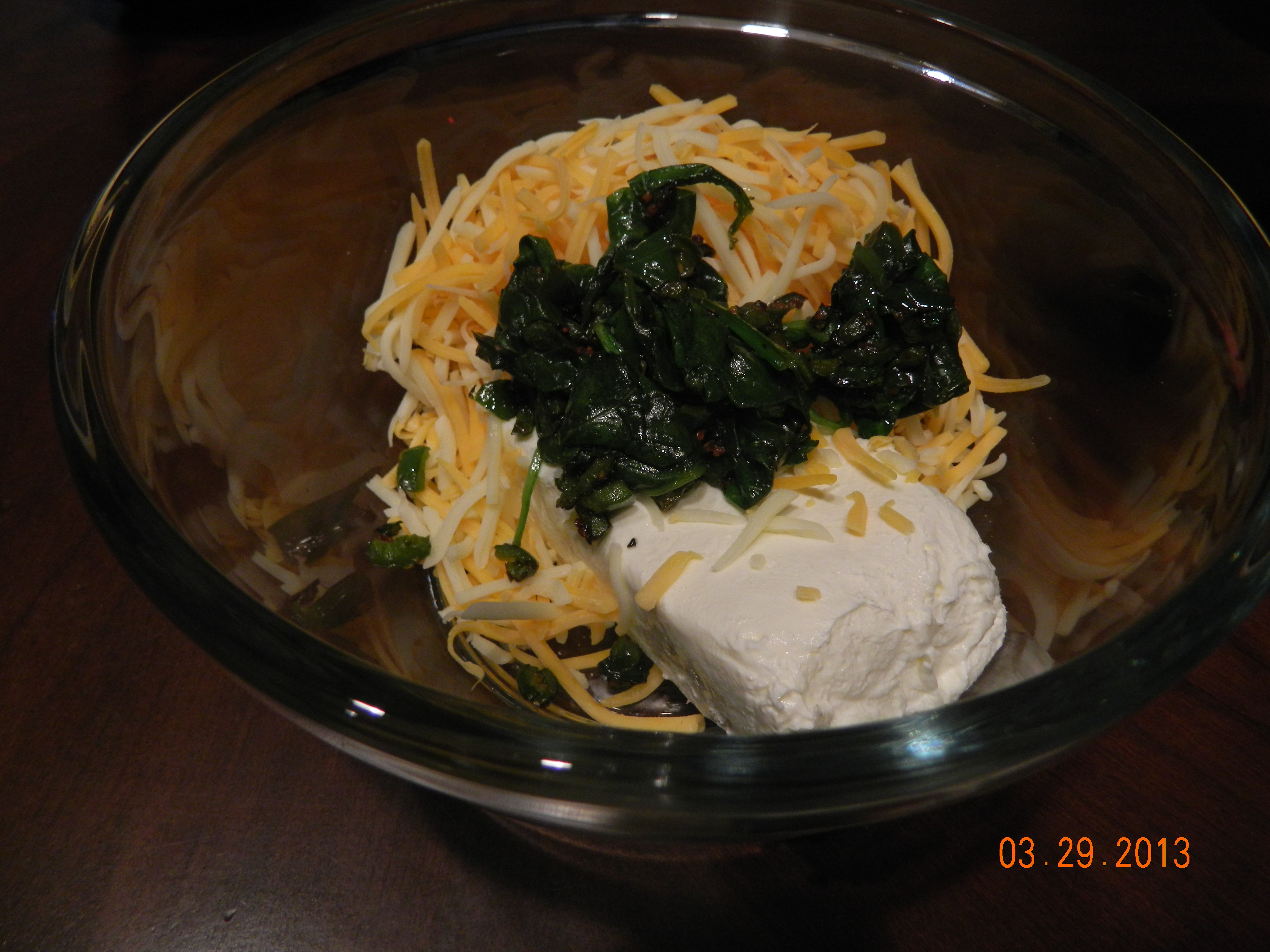 Put cream cheese, cheese and sautéed spinach jalapeno mix in a bowl and mix it up.