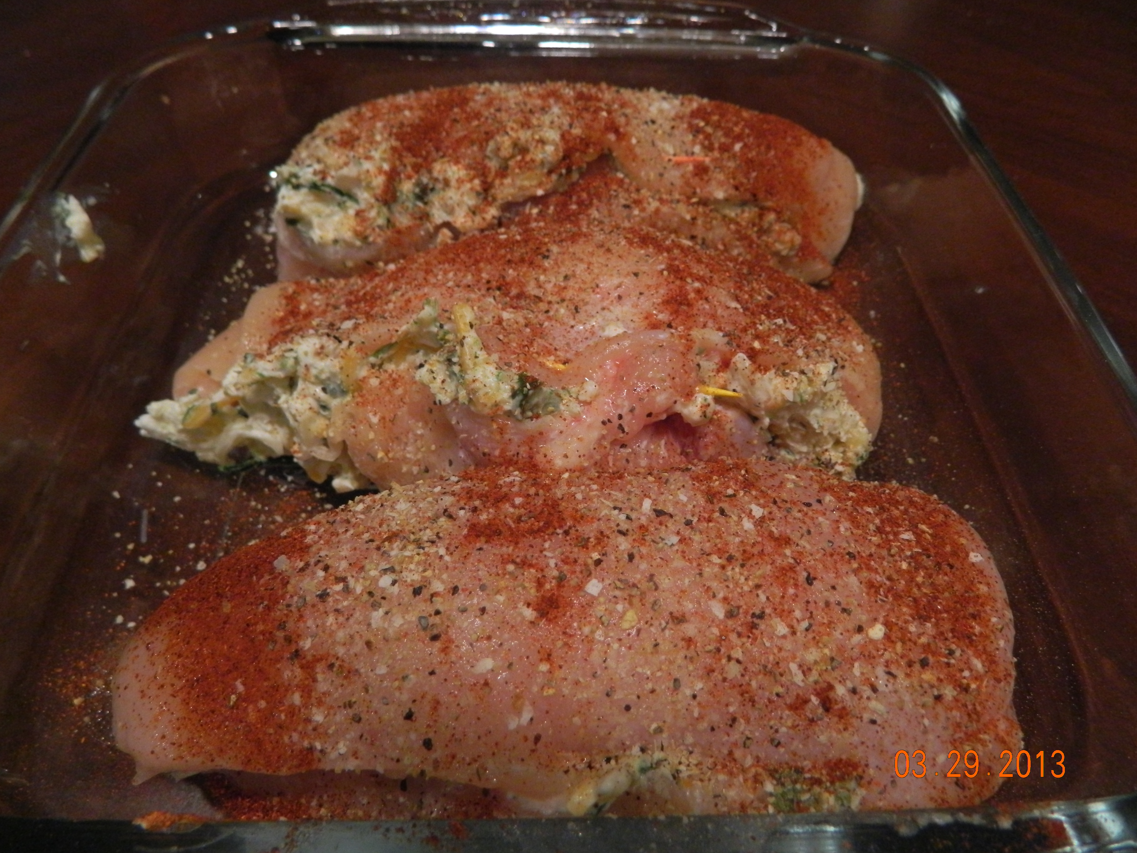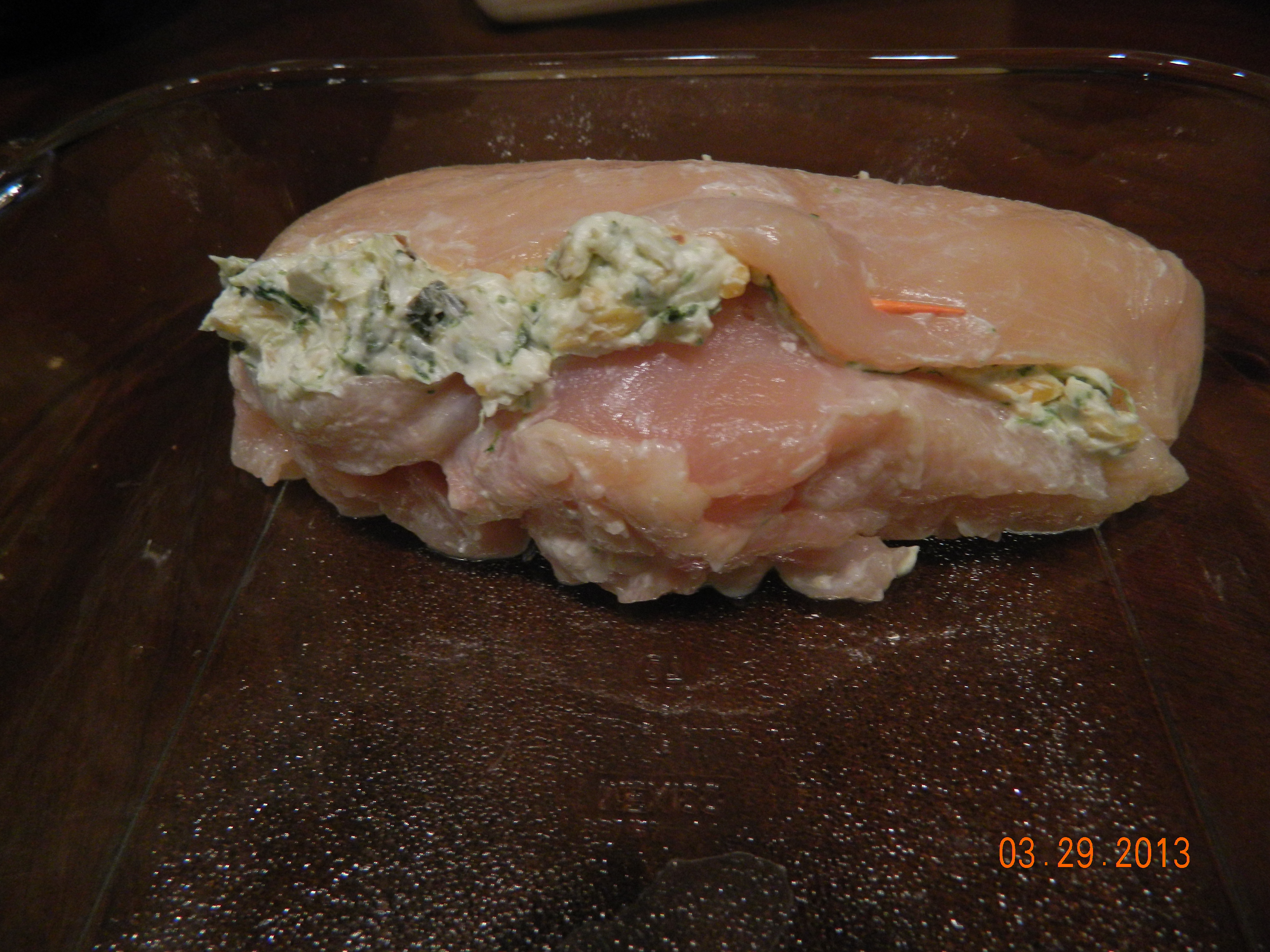 I saw a stuffed chicken on pinterest and even though it looked a little fancy for my cooking skills, I decided to give it a try. It really was an easy recipe and I have to say one of the best things I’ve made. I’m pretty sure it’s all the cheese that is in the stuffing that made it taste so good. The only advice I have is to remember to take the toothpick out when it’s done cooking. I learned that one the hard way!!