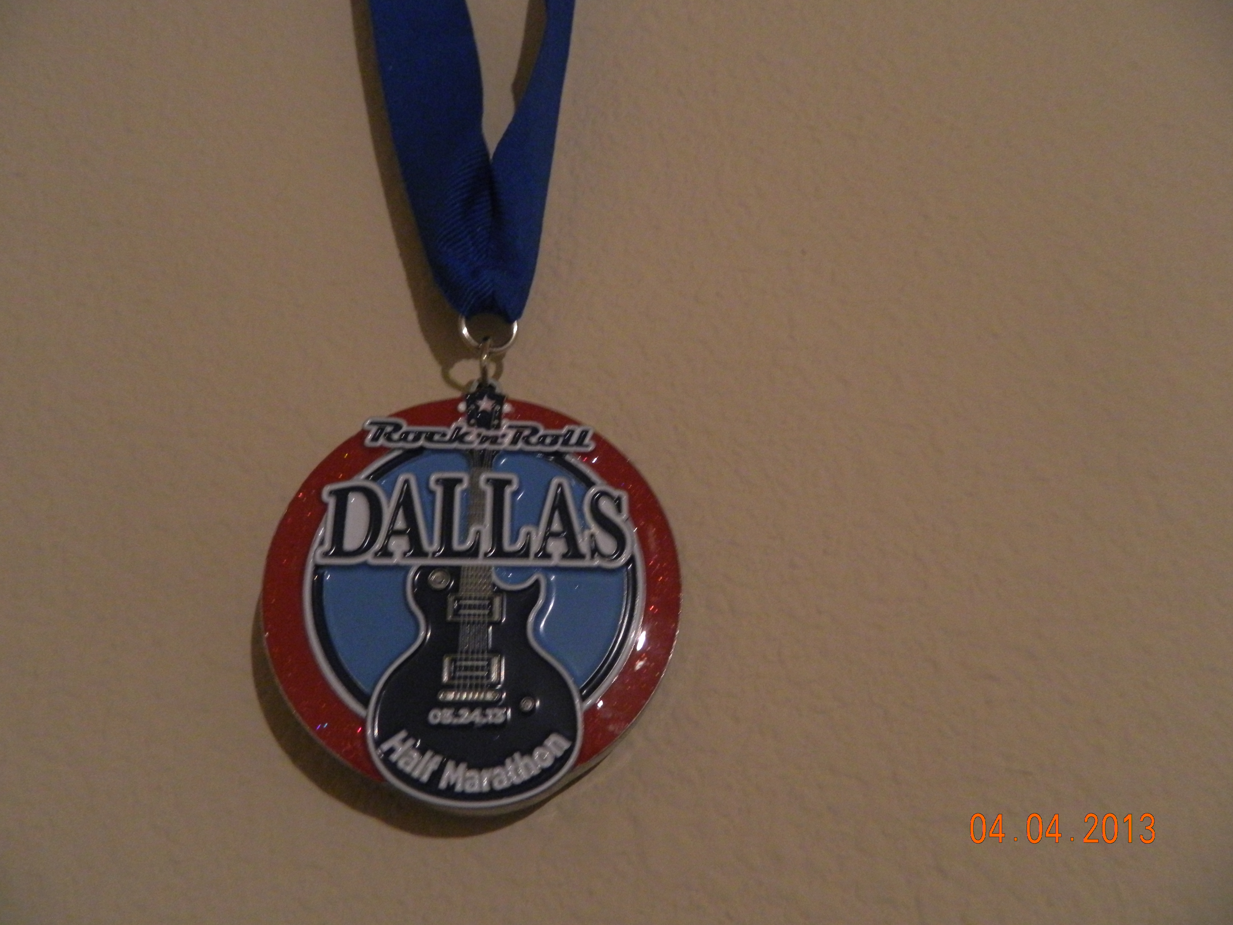 Last weekend I ran in the Rock and Roll Half Marathon. I guess “ran” may be a bit of an exaggeration. I ran part of it. I ran for the first 2 miles and then I hit a real steep hill and had to walk to the top of it. I ran for another 2 miles and then had to take a bathroom break, (which is kind of gross when all you have is a port-o-let). After that I had to alternate walking and running in much shorter increments for the remaining 9 miles. I got a little added motivation to keep going at miles 5, 9, and 13 when I saw a very good friend cheering me on with a poster made especially for me with my favorite colors on it. Every time I thought I couldn’t go another step, I thought about how I would be seeing her standing there in just a little bit. I appreciated her being there more than she will ever know!! I kept all my miles, (except the bathroom break mile), at under 13 minute miles. I finished at 2:43:02. The last time I attempted a half marathon, I finished in 3:07, so I was pretty proud of myself. I love my medal. I want to start doing more races that give medals so I can start a medal collection. I’ve found lots of cool display frames for them, but it would look pretty silly with just one medal hanging there. This weekend I will be riding in the Tour Dallas, but no medals for that!!
