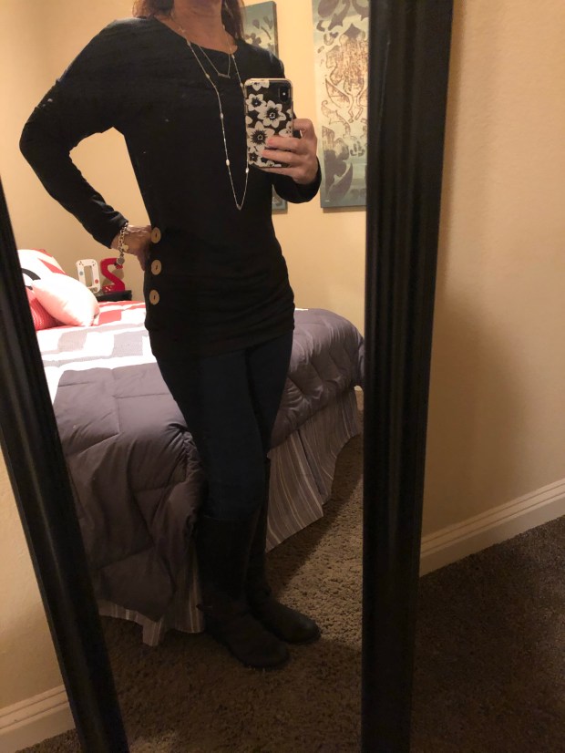 I’m really enjoying my shopping sprees from Amazon! I found this really cute shirt with button detail.  It’s really cozy and fits great.  I ordered it in gray, but it comes in many different colors.  It fits as expected; this one is a size small.  I give it two thumbs up!