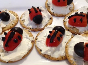 These were cute little appetizers. They are just crackers, herb cream cheese, cherry tomatoes cut in half, black olive halves, and decorating gel to make them look like little lady bugs. I helped decorate them.