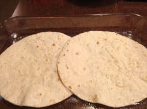 Spray the pan with pam, then put tortillas down for the bottom layer