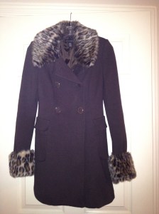 It’s 72 degrees outside today in Austin, Texas. The sun is shining. I’m wearing shorts and a t-shirt. It’s a beautiful day. I go to Barton Creek Mall to pick up my new Prada glasses. While I’m there, I decide to go to Macy’s because my sister has told me that she heard they have Miss Me Jeans on sale. (I found one style on sale, but they had flap pockets and those don’t look good on me.) Since they don’t have any I like, I look around at all their sale stuff and I find beautiful jackets/coats on sale for $29.00. I am pretty much obsessed with coats. It could be 105 degrees out and if I saw a coat I thought was cute, I’d buy it. I find a beautiful brown coat with leopard trim in my size. It kind of reminds me of my friend whose favorite color is leopard and since I like leopard, too, I have to have it!. I go up to buy the coat and the saleslady tells me they are $59.00. I don’t really need a coat for that much money, since winter is basically over. I tell her that they are all on the $29.00 rack, so she lets me have it for that price. WOOHOO!! SCORE!!!! I may not be able to wear this coat today, but I am now ready for any cold weather we may get for the rest of the Fall!!