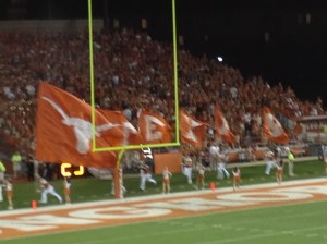 By the time we got to the game, we were so sweaty that my friend ended up buying a new dress at the store in the stadium and changed. We will now refer to her as Beyonce because of the frequent costume changes. All I bought there was a scrunchy to tie up my hair. I was surprised to find out that the store INSIDE THE STADIUM can’t even have the game playing on their big screen TVs because they don’t get the Longhorn Network.