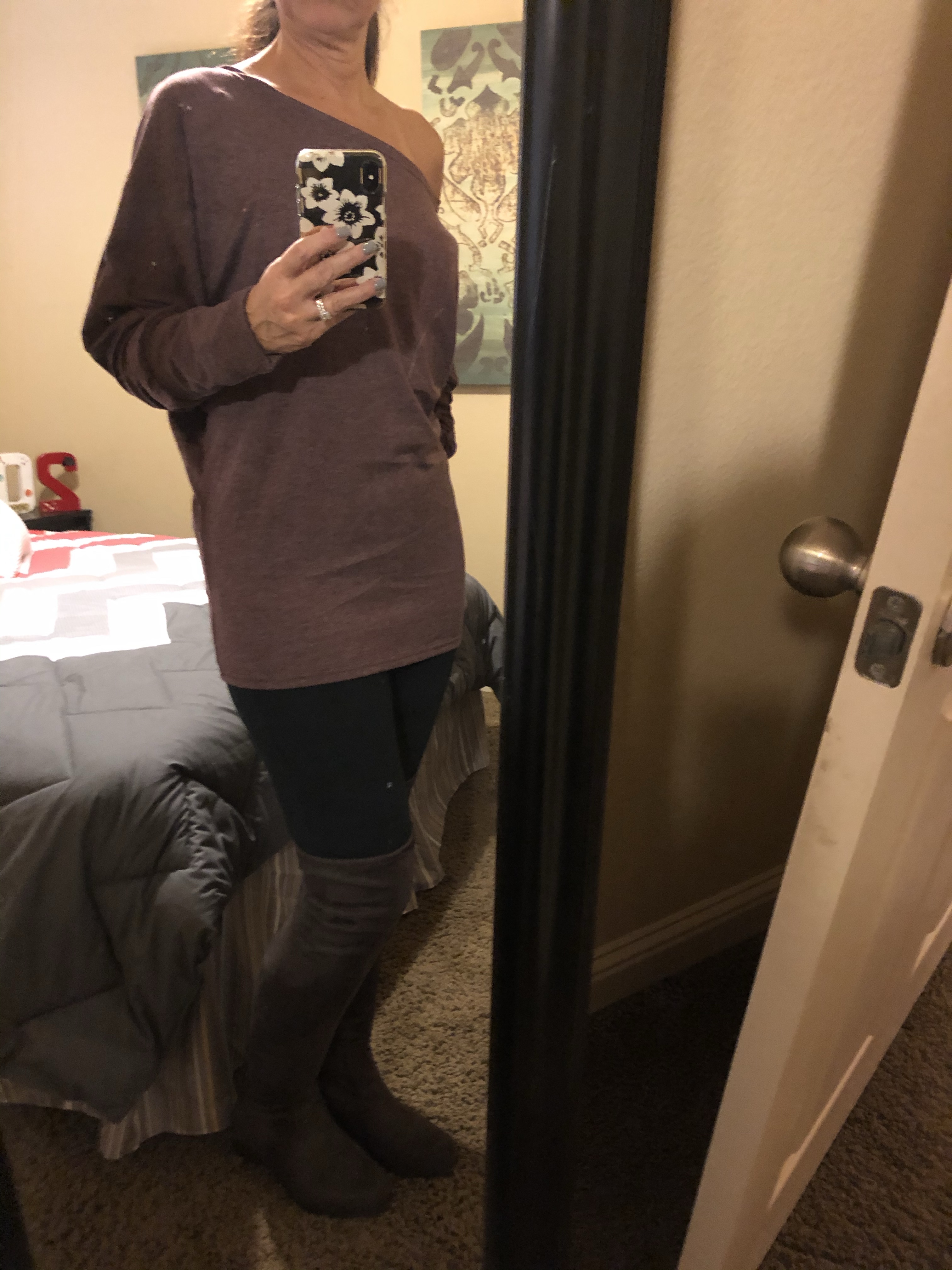 I’m leaning towards the leggings with my over the shoulder sparkly shirt for New Year’s Eve, but I’m going to keep this shirt, because you never know when you’ll need something sparkly!!