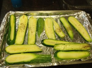 Slice up the zucchini into strips. Spray cookie sheet with cooking oil. Put zucchini on sheet, add salt and pepper. Bake in oven at 425 for 5 – 10 minutes on each side.