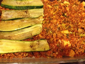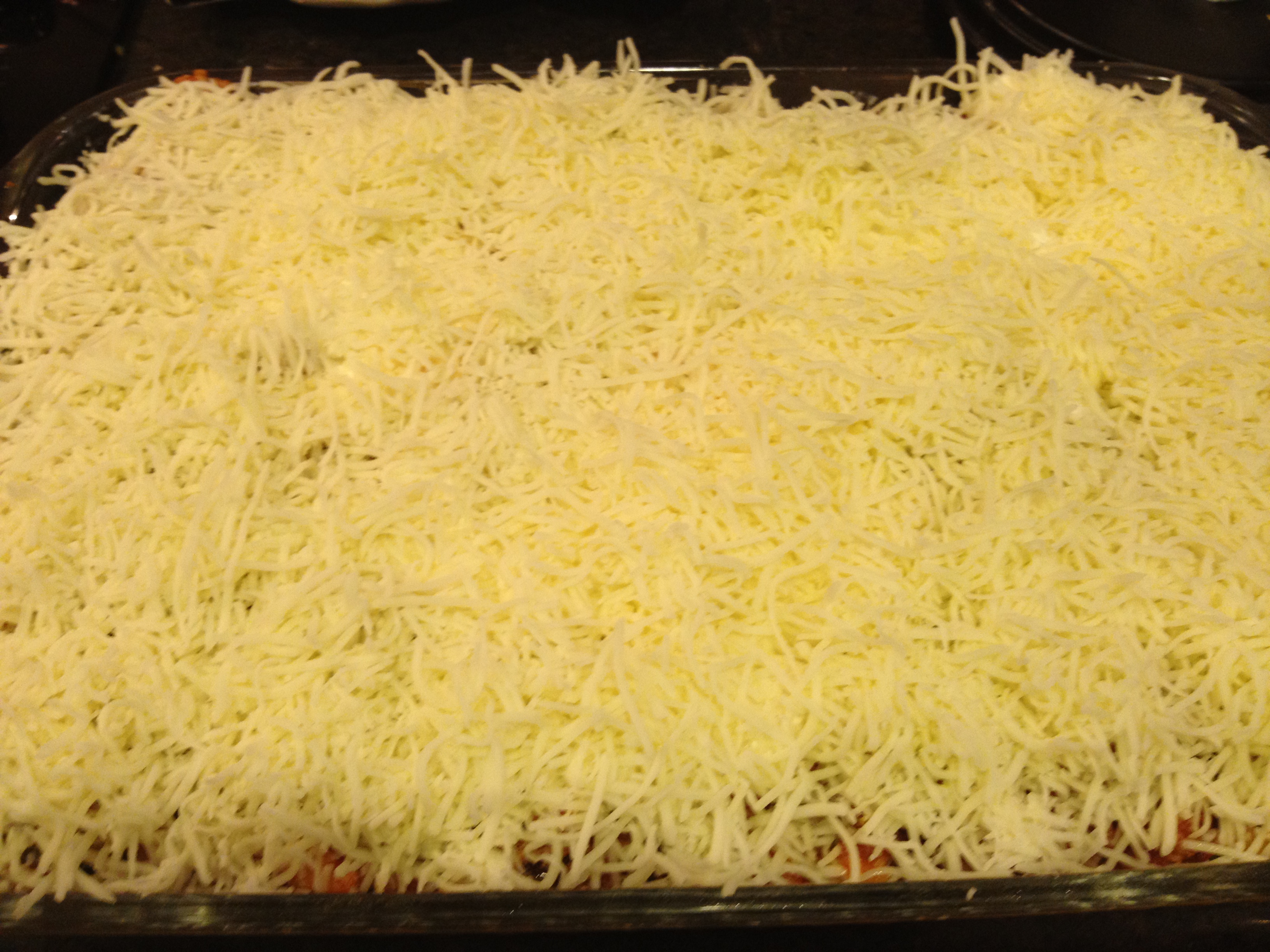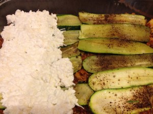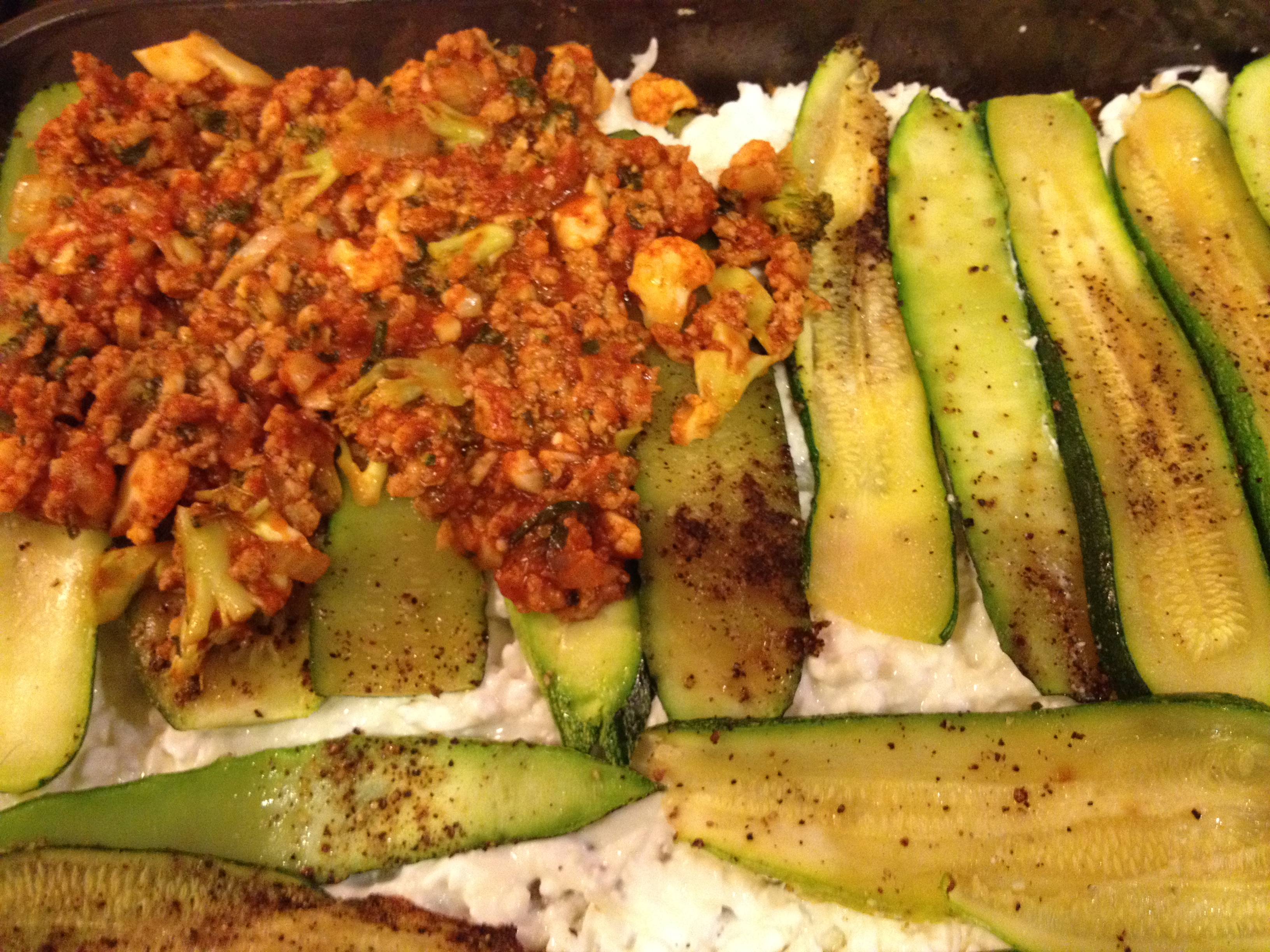 Put a layer of meat sauce on bottom, put a layer of zucchini in a casserole dish.