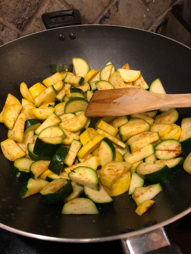 I used a wok, since it holds the most food of all my pans. I put a little olive oil, then threw in the squash and zucchini.