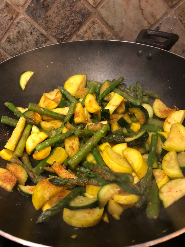 Then I threw in the asparagus and sprinkled the cajun seasoning all over it.